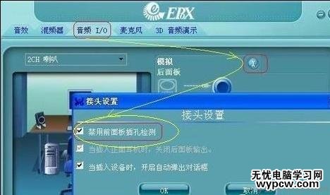 首先切換到“音頻I/O”選項,然后在“模擬后面板”右側有一個設置工具,點擊進入設置之后,在彈出的面板中將“禁用前面板檢測”前面的勾打上即可,之后選擇OK確認即可。