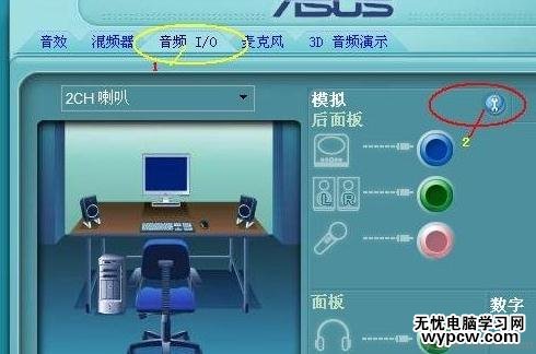 進入“Realtek高清晰音頻配置”界面,選擇切換到頂部的“音頻I/O”選項卡,并點擊“模擬面板”的設置圖標。