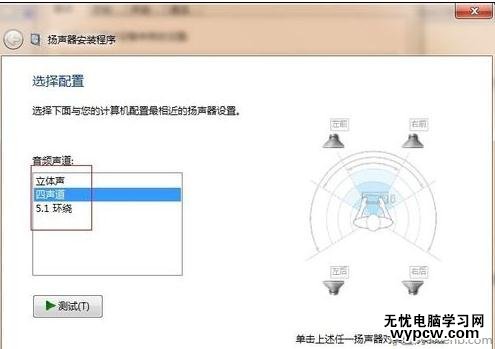 在打開的“揚聲器”中,選擇不同的音頻頻道,測試聲音。(這個時候要把耳機插在主機前邊的耳機孔中),找到一個有聲音的音頻頻道,點擊下一步,完成即可。