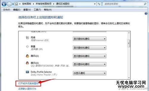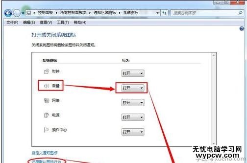 您也可以選擇下方的"打開或關閉系統圖標",再選擇“音量”欄目,在行為上選擇“打開”。或許選擇下面的“還原默認圖標行為”找回聲音圖標。