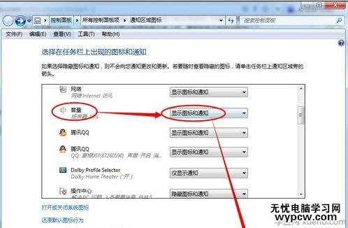 在彈出的窗口上,選擇音量圖標,在選項里選擇“顯示圖標和通知”。