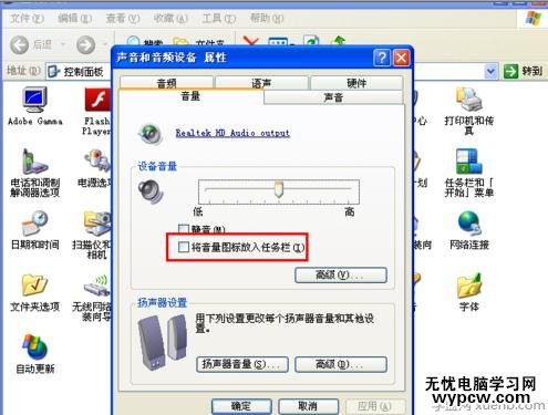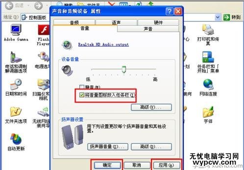 勾選“將音量圖標(biāo)放入任務(wù)欄”,然后點(diǎn)擊對(duì)話框下面的“應(yīng)用”和“確定”按鈕完成設(shè)置