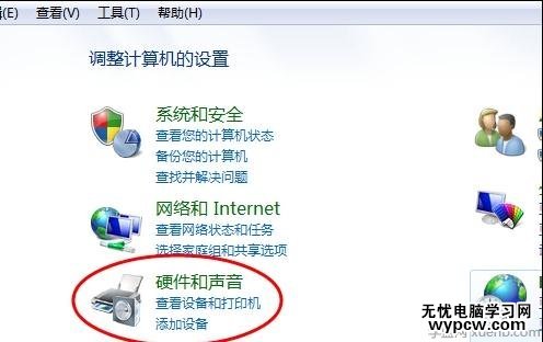 在彈出的對話框里點擊“硬件和聲音”選項進入下級頁面;