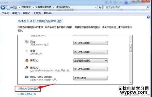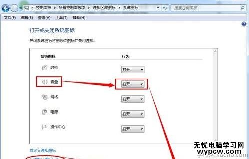 您也可以選擇下方的"打開或關閉系統(tǒng)圖標",再選擇“音量”欄目,在行為上選擇“打開”。或許選擇下面的“還原默認圖標行為”找回聲音圖標。