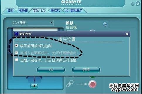如上圖步驟,首先切換到"音頻I/O"選項(xiàng),然后在"模擬后面板"右側(cè)有一個(gè)設(shè)置工具,點(diǎn)擊進(jìn)入設(shè)置,之后在彈出的面板中將"禁用前面板檢測(cè)"前面的勾打上即可,之后選擇OK確認(rèn)即可,如下圖: