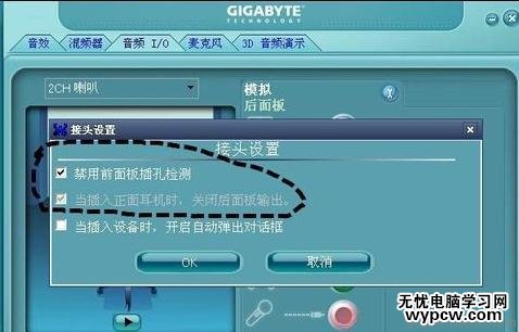5.把“禁用前面板插孔檢測”和“當插入正面耳機時……”打鉤,最后一個取消打鉤。