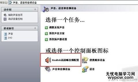 由于很多操作系統本身默認的音頻屬性設置中默認的是禁用前面板插孔檢測的,請進入電腦桌面左下角的開始——控制面板——選聲音、語音和音頻設備——Realtek高清晰音頻配置