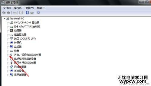 在設備管理器中,列出了電腦的所有硬件,其中在聲音視頻和游戲控制器選項中,包含了聲卡驅動的信息。用鼠標點擊一下前面的小三角。