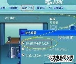 如上圖步驟,首先切換到"音頻I/O"選項(xiàng),然后在"模擬后面板"右側(cè)有一個(gè)設(shè)置工具,點(diǎn)擊進(jìn)入設(shè)置,之后在彈出的面板中將"禁用前面板檢測(cè)"前面的勾打上即可,之后選擇OK確認(rèn)即可,如下圖: