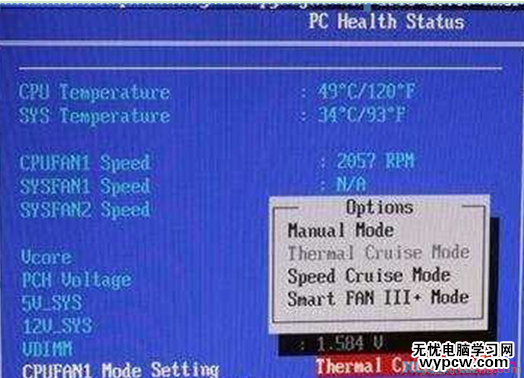 1、在主板和CPU風(fēng)扇都具備自動(dòng)調(diào)速的情況下,接下來(lái)我們要進(jìn)入主板Coms中進(jìn)行一定的設(shè)置,在PC Health Status單元里面有一個(gè)CPUFAN1 Mode Setting選項(xiàng),此選項(xiàng)就是控制CPU風(fēng)扇的,分別有Thermal Cruise Mode(按溫度調(diào)節(jié))、Speed Cruise Mode(按轉(zhuǎn)速調(diào)節(jié))、Smart FAN III+ Mode(智能模式)這三個(gè)模式;