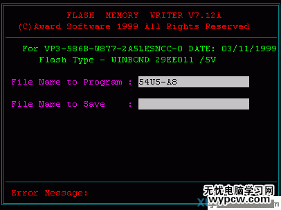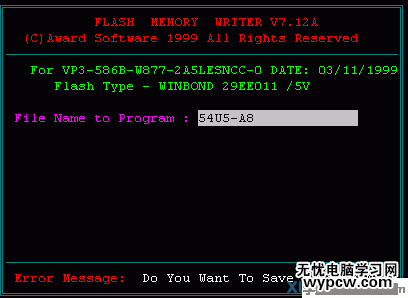 提示文字 “Do You Want To Save BIOS (Y/N)”。意思是問你是否要將主板上的BIOS程序存盤。如果要存盤就鍵入“Y”將會提示您想存儲的BIOS程序文件名,見圖二: