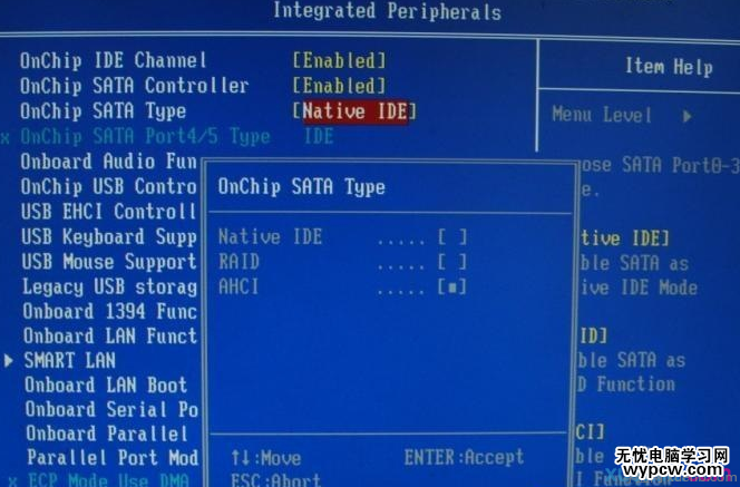 硬盤的AHCI模式的設置位置一般在Integrated Peripherals集成設備界面里,首先選擇OnChip SATA Type,接著可以看到下面的三個選項,Native IDE/RAID/AHCI,如果需要關掉AHCI,則選擇Native IDE即可,開啟則選擇AHCI。有些筆記本上可能只有AHCI和ATA還有DISABLE選項,可以選擇ATA模式也可以。還有顯示Compatible Mode兼容模式的,意思也是Native效果相同。