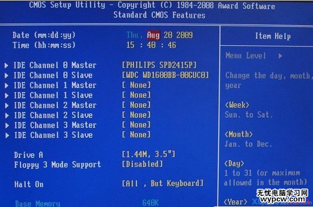 如果我們要在BIOS里調整系統時間,首先選擇Standard CMOS features,然后通過移動光標到對應的時間或日期上,接著按鍵盤上的+、-鍵進行調整,最后保存(保存方法參下)即可,如下圖: