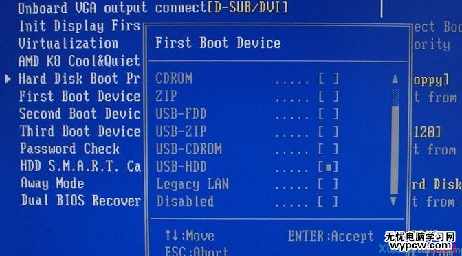 B、設置計算機從USB啟動方法:可以選擇USB-HDD或USB-ZIP(根據USB啟動盤類型確定),首先選擇First Boot Device,然后會彈出一個設備選擇框,里面有幾個選項(如下圖),一般選擇USB-HDD即可(視乎USB啟動盤的類型)。