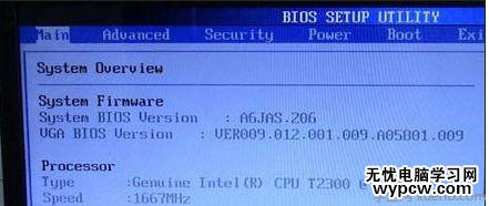 從左到右依次是:Main(基本設定)、Advanced(高級設定)、Security(安全性能選項)、Power (電源管理設定)、Boot(啟動設備設置)、Exit(退出Bios程序設置)。