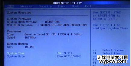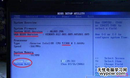 這個菜單可對基本的系統配置進行設定,如時間,日期等。也是本本的系統概況(Syetem Overview),我畫線的部分分別是系統BIOS版本號、顯示器BIOS版本號;接下來是CPU信息、核心速度;再下面是內存信息。用圓圈的部分是電腦的時間和日期,可以設置本本的時間和日期。