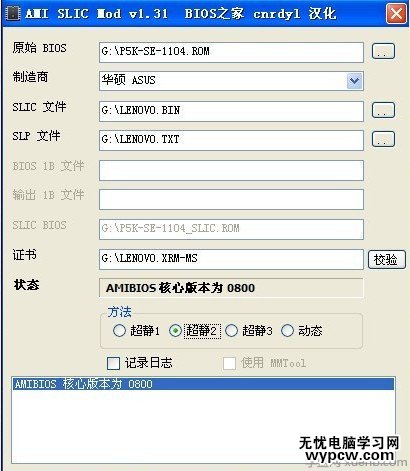 1、準備好相關的文件和工具后,最好先備份BIOS,將相關工具和文件放在同一目錄中,打開刷BIOS工具(AMI 的BIOS雙擊SLIC.exe文件,Award的BIOS雙擊AwardTool_cn.exe文件,這里以AMI為例,相關工具和文件都放在G盤根目錄),按照對話框選項載入相關文件,如圖:
