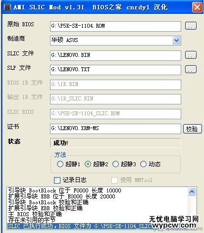 3、提示執行成功,至此,制作帶SLIC2.1 的BIOS的步驟就成功了,接下來就是使用BIOS刷新工具將制作的新BIOS文件刷入計算機系統BIOS中了,這個方法比較簡單,就不說了。