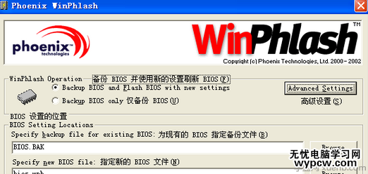 在主界面可自行設(shè)置,備份的同時刷新,還是只備份不刷新,具體請參考上圖即可。另,在Specify backup file for existing BIOS,可以自行設(shè)置備份BIOS文件的保存目錄,可通過Browse按紐輕松設(shè)置;在Specify nes BIOS file選擇中,設(shè)置你要刷新的BIOS文件的所在目錄,也可通過Browse按紐設(shè)置。
