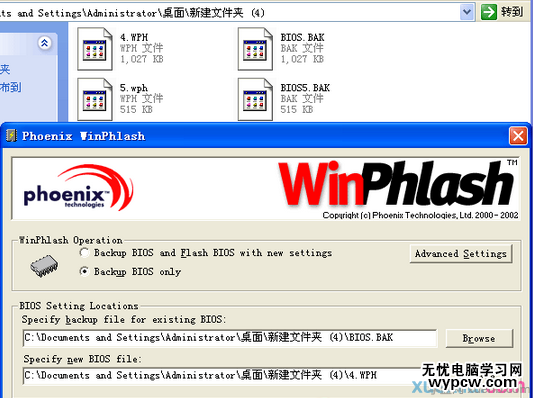 而且如果有WPH BIOS文件,即Phoenix BIOS文件,我們可以從任何主板中備份出BIOS文件的,如AMI或AWARD的BIOS;而且備份出來的BIOS文件的大小,是根據(jù)你輸入的WPH文件的大小來設(shè)置的。如你選擇對應(yīng)的WPH文件為515K,那么你備份出來的BIOS文件也是515K的,如果你選擇對應(yīng)的WPH文件為1027K,那么備份出來的BIOS文件也是1027K的,其并不是針對你的主板BIOS芯片的容量來備份。從此即可看出,Phoenix BIOS文件中,是有設(shè)置信息的。