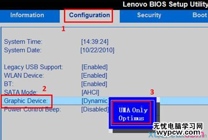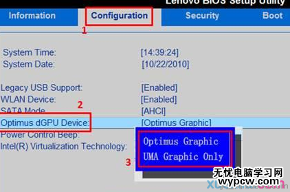 2. IdeaPad Y460A/Y560A/V360A/V460A/U460A:依次選擇“Configuration”、“Graphic Device”,其中有兩個選項:Switchable Graphics表示可切換顯卡模式;Discrete Graphics表示獨顯模式