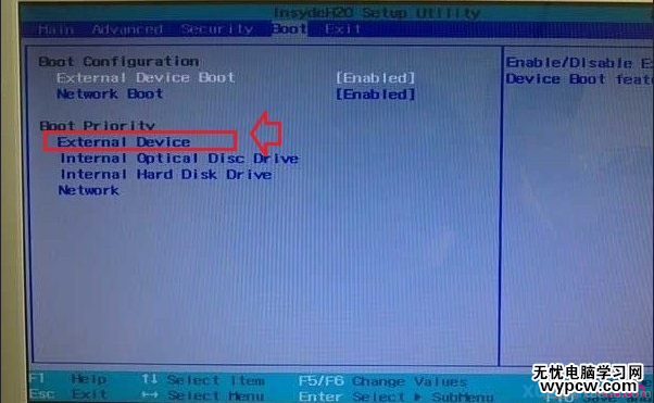 2、以上設置完成后,我們再利用鍵盤上的向下鍵(↓),選中“Extermal Device”項,此時我們再按鍵下鍵盤上的F5鍵改變設置,之后即可看到把“External Devic”會移動到“Boot Priority”項目的最頂部,也就是將移動U盤設置移動到啟動項頂部了,如下圖所示: