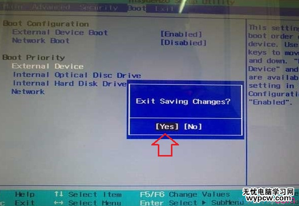 3、當我們看到Extermal Device設置項位于Boot Priority最頂部的時候,就已經設置好了U盤設備為第一啟動項了,此次我們再按下鍵盤的上F10鍵保存以上操作設置即可,之后會看到一個提示,意思是確認要修改或者是取消,我們這里選Yes,然后按回車鍵確認修改即可,如下圖所示: