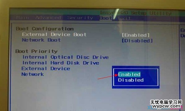 1、在前面我們將索尼筆記本開機,然后按F2鍵后,即可進入到索尼筆記本bios設置,然后我們需要使用鍵盤上的“→(方向鍵右)”,將其切換到Boot選項卡下,然后使用下方向鍵選中“External Device Boot”,之后按回車鍵操作,選擇設置為:Enabled,選用后,按回車鍵(Enter)確認即可,如下圖所示: