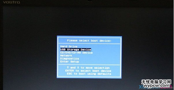 同樣是在電腦重啟或者開機進入標志界面的時候,我們立即按鍵盤上的F12鍵,之后將進入如下快捷啟動項設置界面,這里我們直接選擇第二項“USB Storage Device(有些直接顯示插入筆記本的U盤名稱,總是是含有USB字樣的這項)”,選中后,我們直接按Enter(回車鍵),之后即可進入U盤啟動界面了。