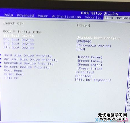按鍵盤區的箭頭方向鍵,移動選擇項至“Boot Options”(啟動選項。)