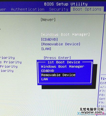 移動光標到“First Boot Device”選項,然后按"Enter"鍵。出現對話框后,將光標移動到“Removable Device”,然后按“Enter”.