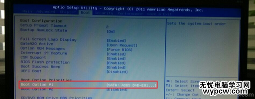 2.進(jìn)入BIOS設(shè)置界面后,用鍵盤上的“←→”方向鍵選中“BOOT”欄目,用鍵盤上的“↑↓”方向鍵選中,Boot options #1條目,并按下回車鍵,如圖1所示: