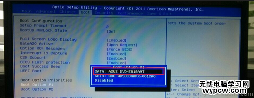 3. 在出現(xiàn)的界面中,用鍵盤上的“↑↓”選中代表CD/DVD字樣的文字,此處墨染暖心的電腦是“SATA:ASUS DVD-E818A9T”,選中并按下回車鍵,如圖2所示: