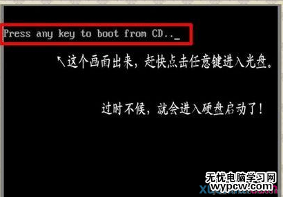 設置光驅為第一啟動項之后,重啟電腦,開機就會讀光盤(具備引導功能的光盤),但此時會有一個提示:Press any key to boot from CD…… 一晃而過,用戶需要迅速點擊任何鍵值予以確認光驅啟動,否則會被電腦認為不需要光驅啟動,轉而讀硬盤了。