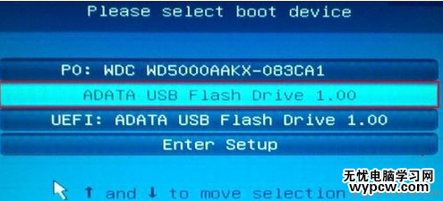 2、接著屏幕會出現一個多選擇的選項窗口,其中“ADATA USB Flash Drive 1.00”就是小編所插入的u盤啟動盤,使用鍵盤上的方向鍵移動到此選項即可,如下圖所示: