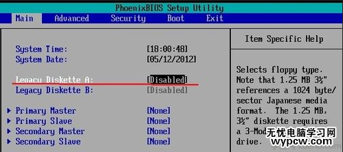 2、BIOS的主界面下,Legacy DisKetta A一項,原來是1.44MB IN的,回車,改為"Disable".因為軟驅淘汰了,更不會有人在虛擬機里用到軟驅,禁用掉可以加快開機速度。