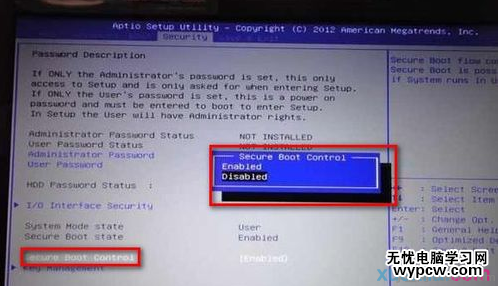 2、切換到Security標簽,找到Secure BOOT Control,將Enabled改為Disabled,這一步的作用是關閉微軟的Secure BOOT,這個功能開啟會導致不能識別U盤啟動系統的安裝