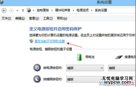 3.進入“電源選項”后,再進入“喚醒時需要密碼”或者“選擇電源按鈕功能”等等;