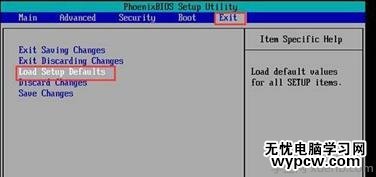 2、在bios界面中使用“←→”鍵移動光標至“exit”項,使用“↑↓”移動光標至“load setup default”項,按“enter”鍵。
