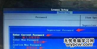 3、選擇supervisor password回車,在首行enter current password輸入當前超級管理員密碼,并回車跳到第二行,無需任何字符輸入,繼續回車跳到第三行,繼續回車。