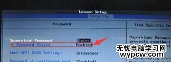 2、選擇passWord選項,回車進入如下界面(紅框標記為enabled即表示當前設置了bios超級管理員密碼)。