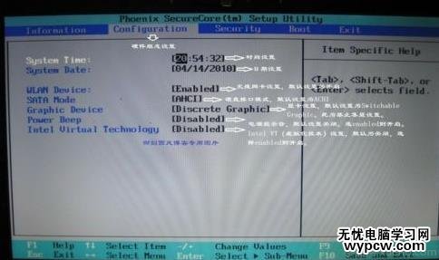 下圖是硬件組態設置。主要包括:時間、日期設置,無線網卡、硬盤接口模式、顯卡、電耗提示音、因特爾虛擬化技術等設置。相關詳細設置如下圖(圖中把AHCI寫成ACHI了,特此更正):