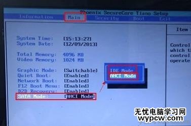 用鍵盤的上下左右鍵。移動到【Main】處,再用下鍵移動到【SATA Mode:AHCI Mode】處,按回車鍵,就可以看到該主板支持兩種IDE Mode、AHCI Mode類型。