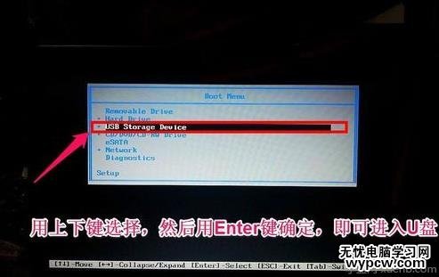 2,進(jìn)入到快捷啟動(dòng)菜單后,選擇USB Storage Device這一項(xiàng),中文意思是“U盤存儲(chǔ)盤”,尤于版本不同可能會(huì)有所差別,有的可能直接是U盤的名稱,總的來說,一般帶有USB一類詞匯的就是U盤,然后按Enter鍵,就能馬上從U盤啟動(dòng),當(dāng)然,你得在開機(jī)前就要把U盤插上才可以。