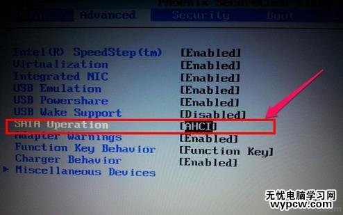 7,進(jìn)入到Advanced這一項(xiàng)后,選擇SATA Uperation這項(xiàng),其意思是“SATA工作模式”,然后按Enter鍵,進(jìn)入其子項(xiàng)。