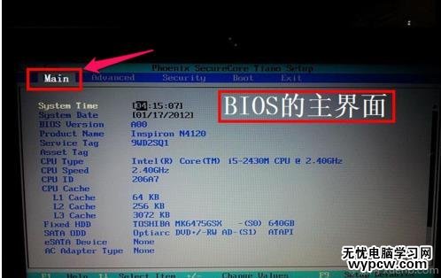 4,剛進(jìn)入BIOS時(shí),默認(rèn)的是Main這一項(xiàng),這里主要是設(shè)置時(shí)間,和一些硬件的顯示,我們不要?jiǎng)舆@里面的選項(xiàng)。