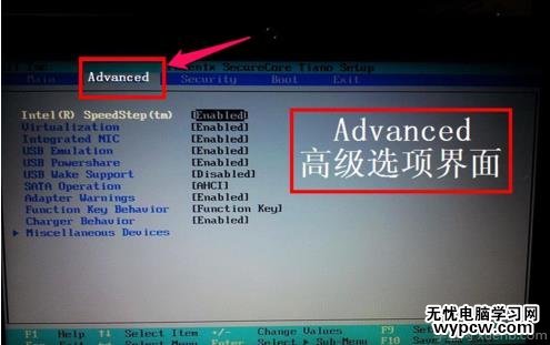 6,設(shè)置硬盤模式,進(jìn)入到BIOS主界面后,把光標(biāo)移到Advanced這一項(xiàng)上,Advanced為高級(jí)設(shè)置意思。