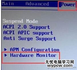 2、在bios界面中選擇“power”選項,用上下鍵選擇到“hardware monitor”,按回車。