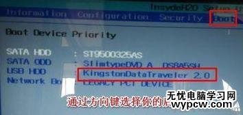 這時候我們在BOOT菜單中通過鍵盤的方向鍵選擇U盤,提醒大家先把U盤插入電腦,然后開機進入BIOS設置,這樣這里才可以發現我們的U盤。