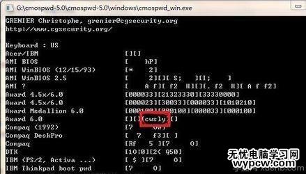 6、也可以使用Cmospwd軟件在命令提示符窗口查看BIOS密碼,它支持Acer、AMI、AWARD、COMPAQ、DELL、IBM、PACKARD BELL、PHOENIX、ZENITH AMI等多種BIOS,操作方法是:在DOS下啟動該程序,BIOS密碼就會顯示出來的。